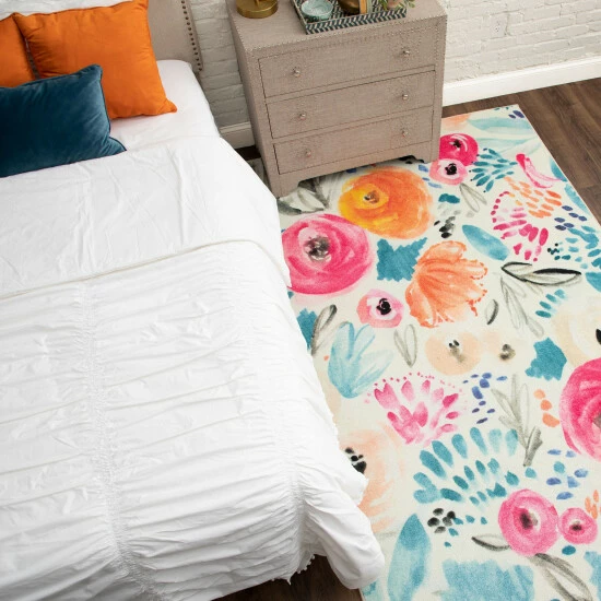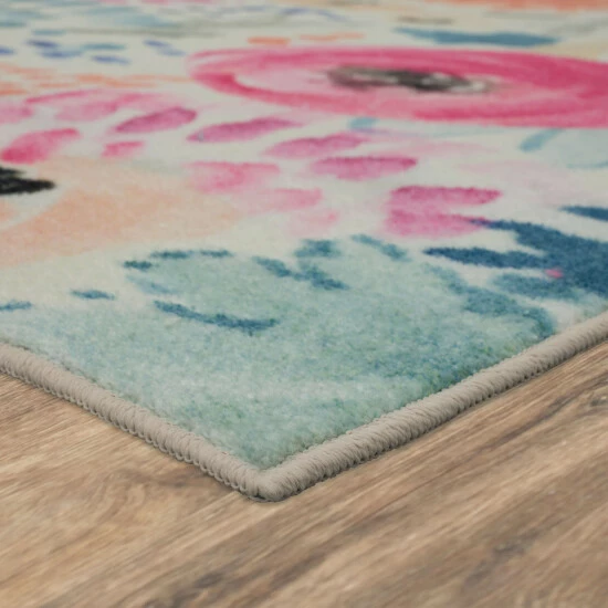 Subdued splashes of blue, pink, orange, and black color the painterly inspired floral motif of the Mohawk Home Floral Watercolor Area Rug. Featuring a cool complementary color palette with a cream base, this design is vibrant and versatile to effortlessly transform any space.