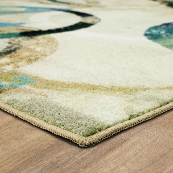 Geometric outlines of circles in mineralized distressed shades of aqua blue, dark charcoal, ivory cream, taupe grey, and neutral beige effortlessly create modern style anywhere with the contemporary design of the Mohawk Home Canvas Rings Area Rug.ย