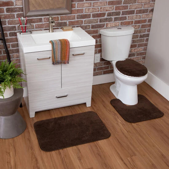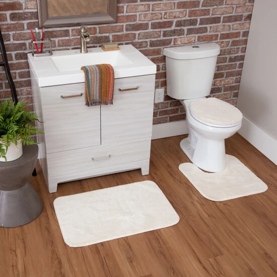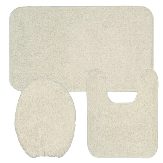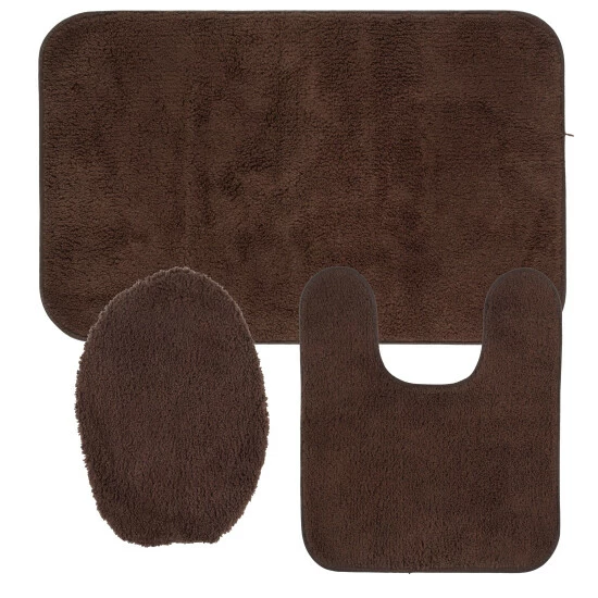 - 3 Piece Set: Set includes one (1) 20 inch wide x 30 inch long bath rug, one (1) 20 inch wide x 20 inch long bath rug, and one (1) 16.5 inch wide x 18.5 inch long universal toilet lid cover.