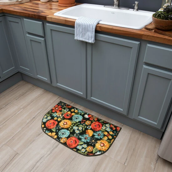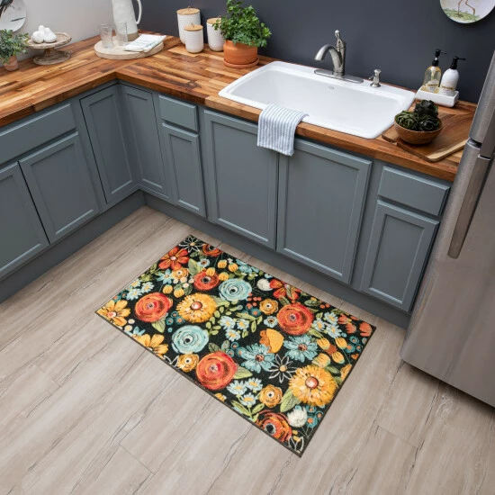 A rich black background gives rise to a stunning colorful garden of orange, green, pink, and blue chalk drawn flowers in the beautiful Mohawk Home Chalkboard Flower Accent Area Rug. Made with exclusive EverStrand, a premium polyester yarn created from post-consumer recycled plastic bottles, this eco-friendly rug offers sumptuous softness and rich colors with the dependable durability needed for busy households. Available in a variety of scatter sizes, this accent rug is a great choice for adding style to a variety of spaces in your home.