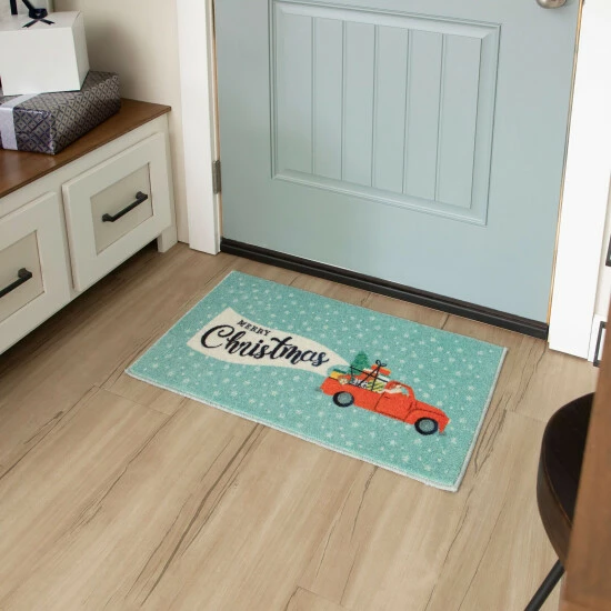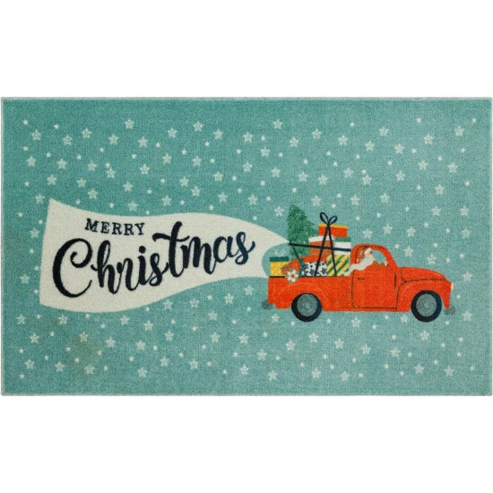 Patterned packages piled in the back of Santaโs red pick-up in a snowy blue and white holiday scene send cozy cheer with the seasonal style of the Mohawk Home Christmas Present Truck Accent Rug in Multicolor. ย This designer accent rug is available in size 18โ x 30โ, 24โ x 40โ and 30โ x 50โ and is ideal for entryways, kitchens, offices and more. ย Reenergize your space with radiant color and original artwork digitally printed over a plush canvas of Mohawk Homeโs exclusive ecofriendly EverStrandโข, a premium synthetic yarn created from post-consumer recycled plastic bottles. ย While EverStrandโข is renowned for its softness, this silky yarn also offers superior strength stain resistance, illustrious fade resistant color clarity and dependable durability ideal for high-traffic spaces with kids and pets. ย