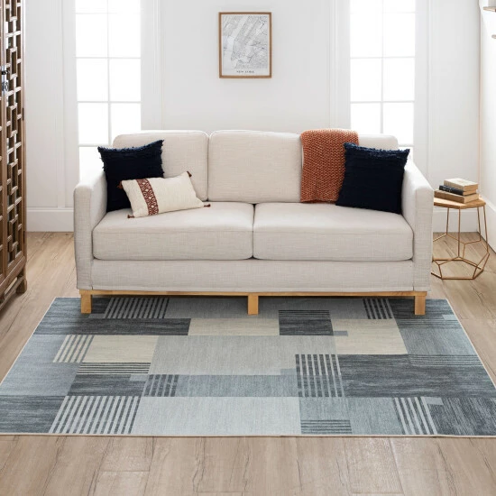 A versatile color palette of neutral and blue hues illuminates the color block design of the Mohawk Home Contempo Block Area Rug. The intriguing contemporary design effortlessly infuses any space with an artful sense of elegance. Flawlessly finished, this collection features bold color clarity and richly defined details with the dependable durability needed for busy households. The dense pile is created with a premium polyester yarn that provides proven stain resistance power while the durable latex backing offers precise placement during daily wear and tear. Great for any indoor space, including the living room, dining room, bedroom, office, hallways, entryways, and more.