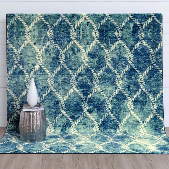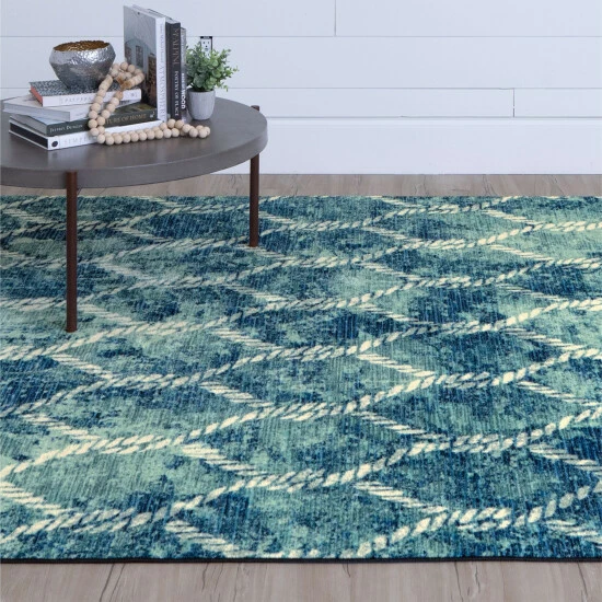 Set a course for stunning design with Mohawk Home’s Diamond Rope Area Rug in Aqua. Featuring a rope lattice pattern on a background of sea washed shaded of blue, this patterns is great complement to coastal settings. When it comes to color, the sky is no longer the limit with the endless possibilities of this design. Thoughtfully crafted in the U.S.A. in small batches utilizing exclusive Precision Dye Injected technology, these patterns are radiantly redefining printed rugs, literally one original design at a time. Designed on a plush EverStrand tufted base, each style in this collection features superior strength stain resistance and a cozy soft touch. Consciously created with EverStrand yarn, a premium recycled polyester produced from post-consumer plastic water bottles, this innovative collection offers environmentally friendly options that are as easy on the eyes as they are the world around us. Keep your new rug and the flooring beneath looking their best with an essential all-surface, earth conscious rug pad, crafted of 100% recycled fibers and certified Green Label Plus by The Carpet & Rug Institute.