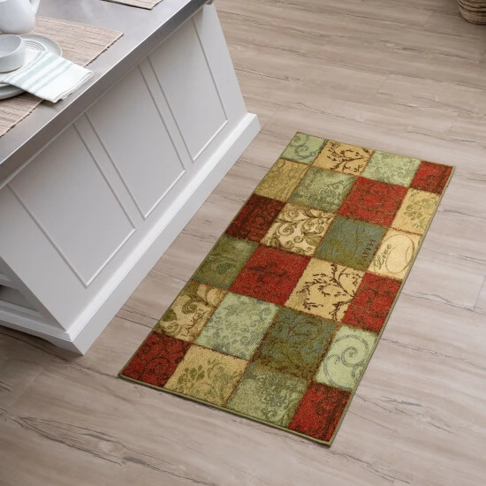 The charming Mohawk Home Floral Tile Accent Area Rug features a transitional patchwork pattern of ornate scroll work designs that will brighten your kitchen dรฉcor. In hues of brown, green, red and light blue accented with grey ornamental patterns, this design is trendy and fun. Made with 100% wear dated nylon, this resilient rug offers sumptuous softness and rich colors with the dependable durability needed for busy households. Available in a variety of scatter sizes, this accent rug is a great choice for adding style to a variety of spaces in your home.