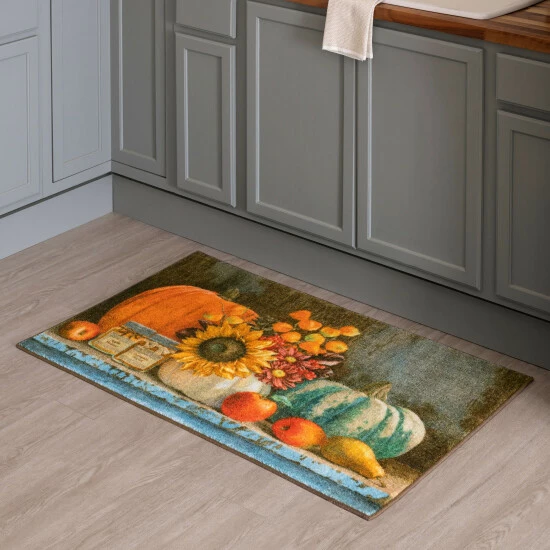 Give thanks for our bountiful blessings this fall season with the autumn inspired floral and pumpkin scene of the Harvest Table Accent Rug by Mohawk Home. This accent rug is ideal for entryways, kitchens, laundry rooms, and anywhere else you desire seasonal style. Made with exclusive EverStrand, a premium polyester yarn created from post-consumer recycled plastic bottles, this eco-friendly rug offers sumptuous softness and rich colors with the dependable durability needed for busy households. Available in a variety of scatter sizes, this accent rug is a great choice for adding style to high traffic areas in your home.