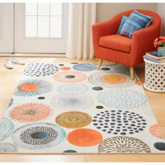 Textured circles in a warm red, green, and blue palette form the theme of this Mohawk area rug. This modern work of art belongs in your dining or living room. Reenergize your space with radiant color and original artwork digitally printed over a plush canvas of Mohawk Homeโs exclusive ecofriendly EverStrandโข, a premium synthetic yarn created from post-consumer recycled plastic bottles. While EverStrandโข is renowned for its softness, this silky yarn also offers superior strength stain resistance, illustrious fade resistant color clarity and dependable durability ideal for high-traffic spaces with kids and pets. Keep your new rug and the flooring beneath looking their best with an essential all-surface, earth conscious rug pad, crafted of 100% recycled fibers and certified Green Label Plus by The Carpet & Rug Institute!