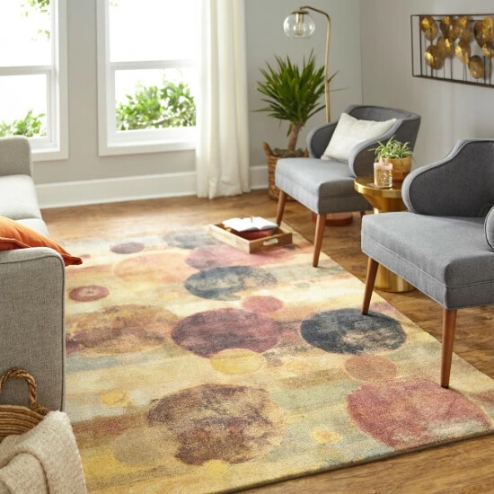 Modern painterly inspired circular orbs and bold stripes create intriguing style in neutral earth tones as showcased in the Mohawk Home Pendulum Area Rug. A dark color palette of rust red, chocolate brown, golden tan, neutral beige, blue grey, and forest green join together to bring this abstract design to life.ย
