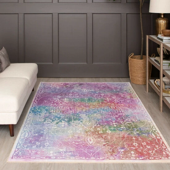 Illuminated by colorful shadows, the Mohawk Home Rowland Area Rug showcases a modern motif of tribal-inspired artistry that appears almost etched into its contemporary canvas. Vibrant with an opulent overdyed color palette, this boho-chic style is available in a variety of color options, including charcoal grey, purple, and teal.
