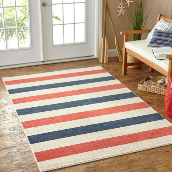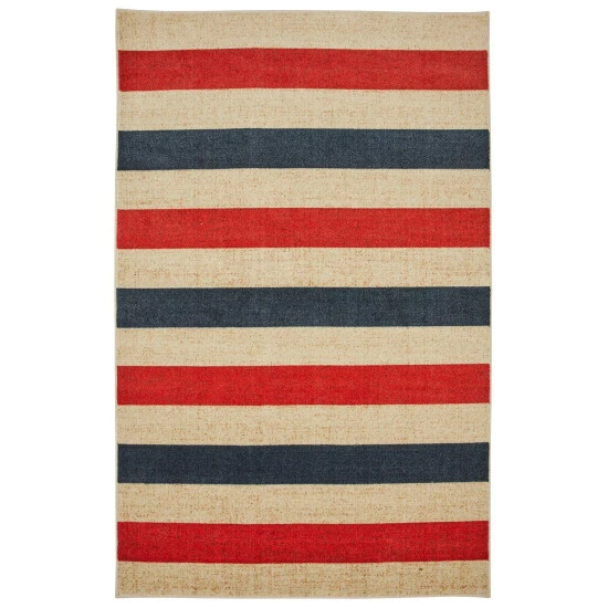 Featuring horizontal stripes of red, white, and blue, the Mohawk Home Sailor Stripe Area Rug evokes patriotic pride. Made with exclusive EverStrand, a premium polyester yarn created from post-consumer recycled plastic bottles, this eco-friendly rug offers sumptuous softness and rich colors with the dependable durability needed for busy households. A great choice for high-traffic areas and households with kids and pets. Available in 5×8, 8×10, and other popular sizes, this area rug is a great choice for adding style to a variety of spaces in your home including the living room, dining room, bedroom, office, kitchen, childrenโs rooms, game room, hallways, and more.