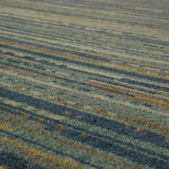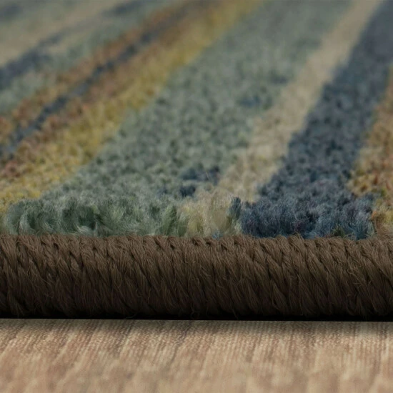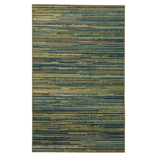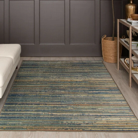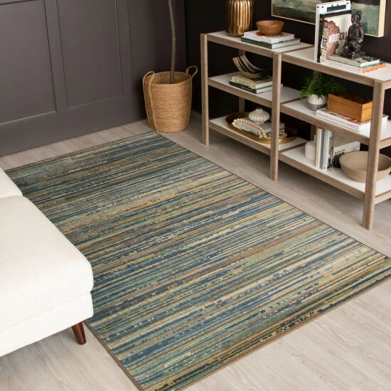 Classicly designed, Mohawk Home’s Santos Area Rug showcases a space-dyed thin stripe motif. This intricate pattern is illustrated in a subdued palette of dark blue, brown, green, and neutral tan.ย