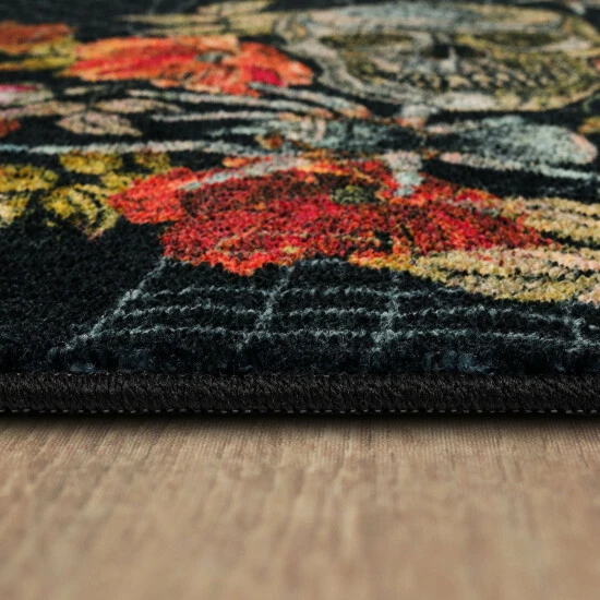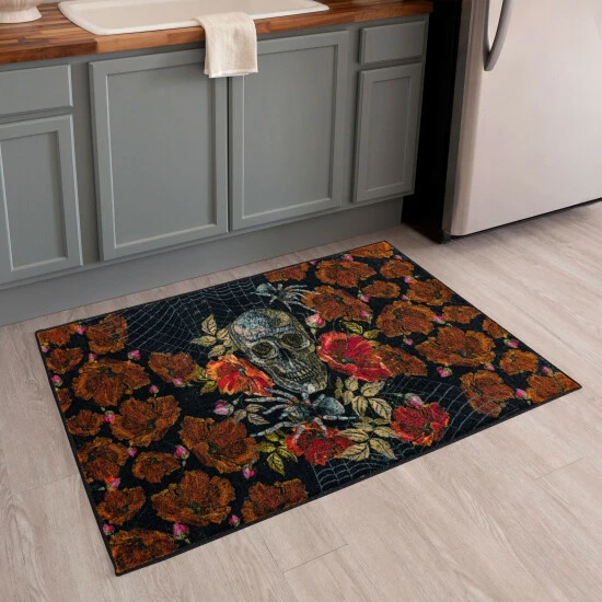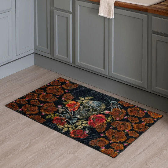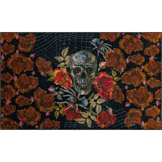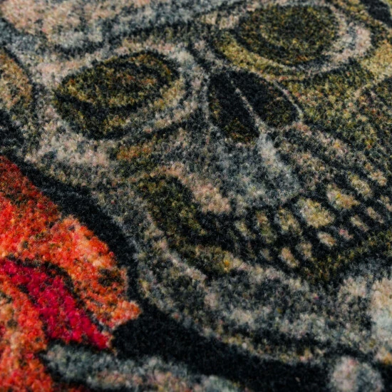Trick-or-treat, please wipe your feet. Greet all your holiday guests with this Halloween themed entryway rug, featuring a skull design. Crafted in the United States from recycled polyester, this accent rug with non-skid backing is a fun statement piece that is a great way to add to your seasonal décor. Featuring original artwork digitally printed over a plush canvas polyester, a premium synthetic yarn renowned for its softness, this silky yarn also offers superior strength stain resistance, illustrious fade resistant color clarity and dependable durability ideal for high-traffic spaces with kids and pets. Cast a decorative spell on your home this Halloween! •FESTIVE DESIGN: This trendsetting holiday inspired mat with a bold color palette instantly adds fun and festive flair to any area.•DURABLE MATERIALS: Made from 100% recycled polyester with a non-skid latex backing, this area rug offers superior strength stain resistance and fade-resistant color clarity while also maintaining super soft feel, fixed shape, and precise placement. A great choice for high-traffic areas and households with kids and pets.•EASY CARE AND CLEAN: The easy-to-clean surface, keeps this area rug attractive for years to come. Simply vacuum regularly, spot clean with a solution of mild detergent and water, or clean professionally when needed.•MADE IN THE USA: As the world’s largest area rug manufacturer, Mohawk products offer a 1 Year Limited Manufacturing Defects Warranty and are proudly made in America of US and imported materials.
