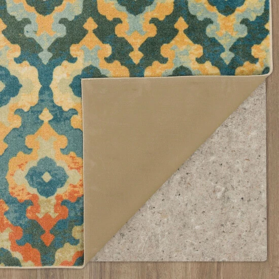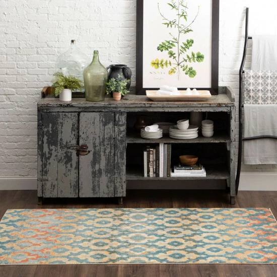 Embrace Venetian-inspired style with the Mohawk Home Zarel Geometric Medallion Area Rug, available in rust. This design features an intricate Mediterranean medallion pattern washed in a copper patina sheen with hues of teal, coral, and peach.
